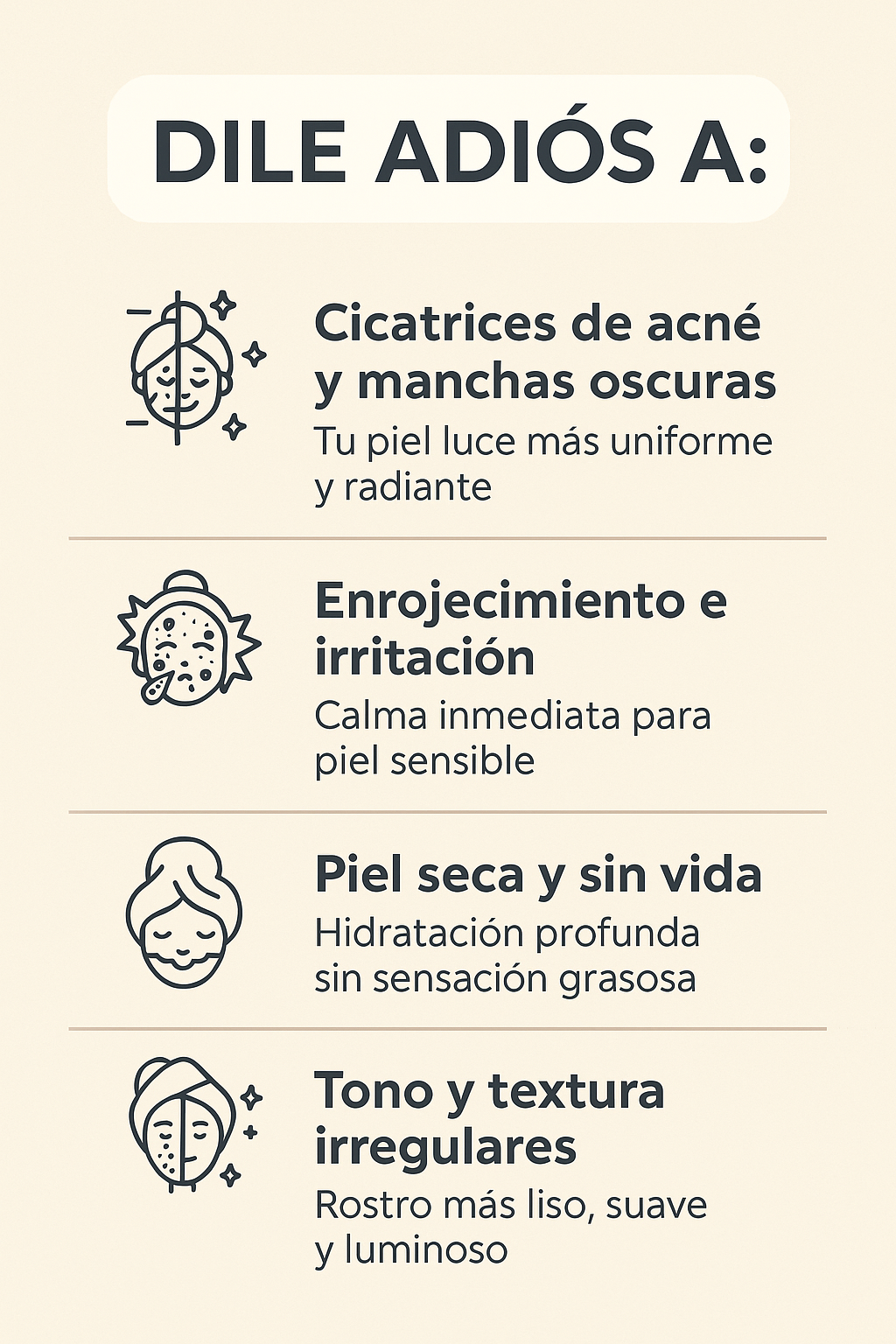 Con 3 potentes activos calmantes, 4 hidratantes y 5 protectores, ayuda a reducir granos, manchas y rojeces mientras fortalece tu piel día a día.